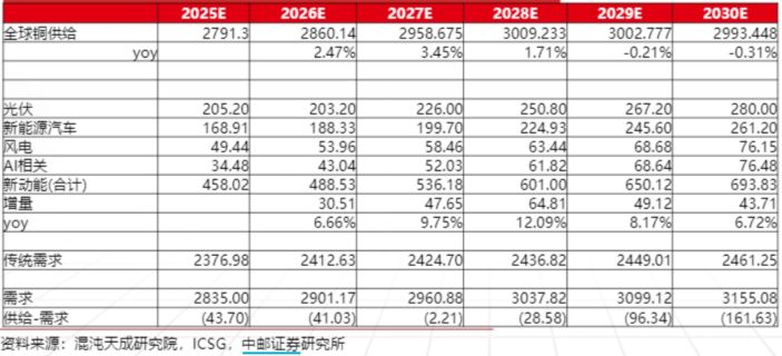 1、铜:供给刚性与脆弱性并存,需求新质动能催化,供需缺口或逐渐增大;供给侧看,铜矿供应扰动频发,多个核心矿山相继大幅下调产量指引,叠加过去十年资本开支不足,铜呈现供给刚性;需求端看,传统需求相对稳健,AI算力、能源革命等新兴需求方兴未艾,铜被称为“AI时代的新石油”,AI有望成为铜需求的下一个支点。全球铜供需缺口逐渐扩大,铜价主升浪有望来临。据中邮证券数据测算,未来5年全球铜供需缺口逐渐扩大,中长期供需短缺的格局愈加清晰,铜价长期有望向好。