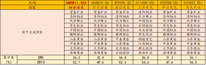 3.龙头集中度领先:中证细分有色金属产业主题指数聚焦铜、金、铝、锂、稀土等兼具战略价值与供需缺口的核心品种,龙头集中度高,前五大成分股集中度高达36%,同类领先。