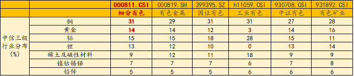2、“金铜含量”同类领先:中证细分有色金属产业主题指数指数铜含量达31%,金含量达14%,金铜含量高达45%,同类领先!