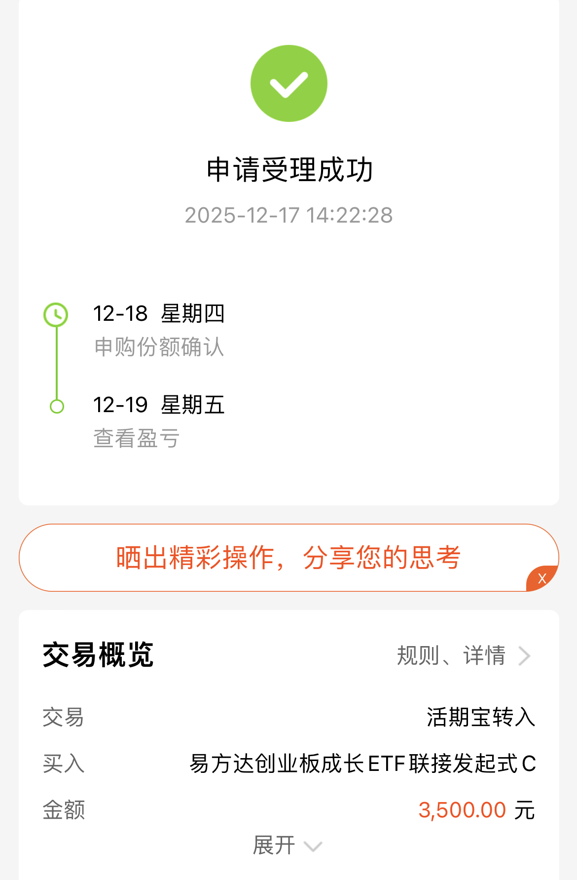今日大盘终于回暖,创业板成长板块的表现格外突出,涨幅直接甩开创业50与创业板指,成了赛道里的领跑者。$易方达创业板成长ETF联接发起式C(OTCFUND|021750)$紧扣创业板成长主线,重仓宁德时代这类高成长龙头股,持仓布局精准踩中板块核心逻辑,近半年涨幅57.11%,远超同类产品平均的20.15%,超额收益明显。我也准备布局起来,它既能借龙头股的爆发力把握板块机会,也是布局创业板成长赛道的优质标的,看好后续发展。