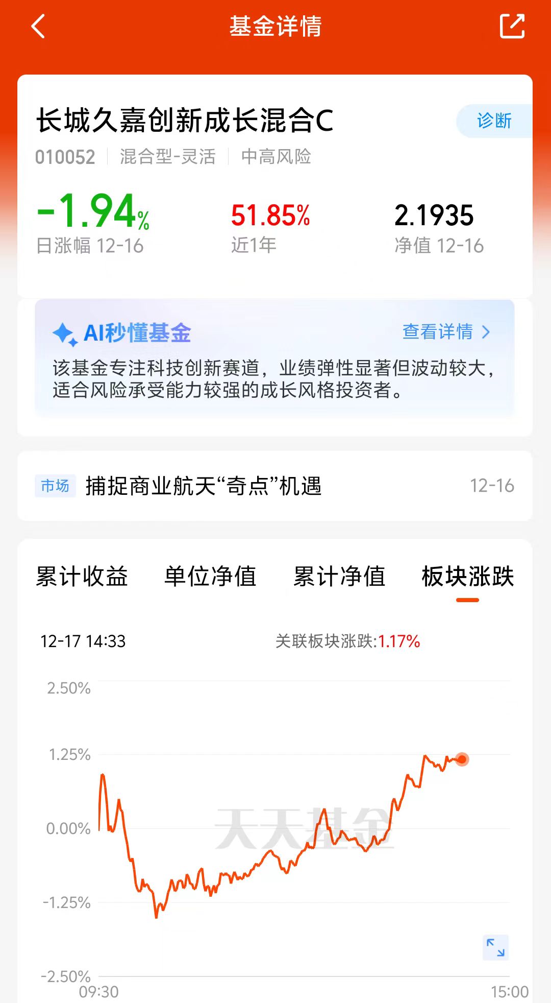 大盘今天回暖上涨,商业航天今天表现也很不错,拉升了一波,目前涨起来了,长城久嘉创新成长混合C持仓主投商业航天+卫星互联网板块,是十五五规划的战略重点方向!商业航天本轮涨了不少呢,长城久嘉近一年涨了51.85%,本轮实现了8连涨,昨天调整后今天又翻红啦,看好这个方正,我准备分批布局了!