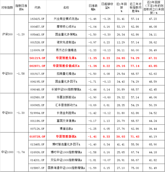 比如华夏的智胜先锋和智胜价值成长,昨日均有0.2%的超额收益,“减震”更加明显;中证1000虽然跌幅最重,但华夏智胜新锐和博时量化多因子也有0.3%左右的超额收益,表现同样优秀。