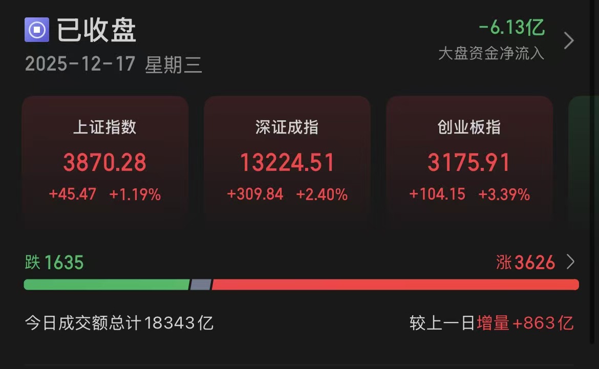 指数表现,沪指上涨1.19%,深成指上涨2.40%,创业板指上涨3.39%。个股涨多跌少,全市场3626只个股上涨,下跌个股1635只。沪深京市场全天成交额1.83万亿,较上个交易日增量863亿。