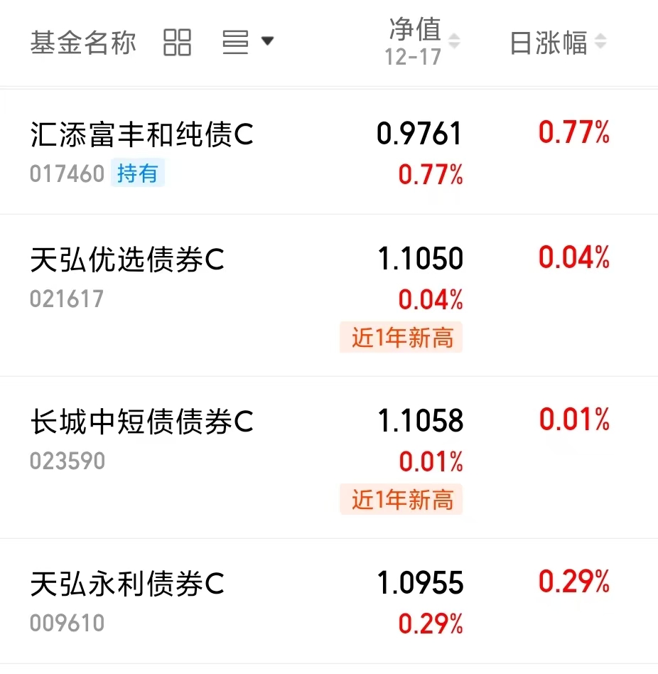 临近年底,还是稳健配置债咯,年底求稳又不想波动太大的我看汇添富-丰和纯债C今天收涨77个蛋还不错哦,按照往年的情况,债市基本上12月都会涨,这波也可以静待行情。