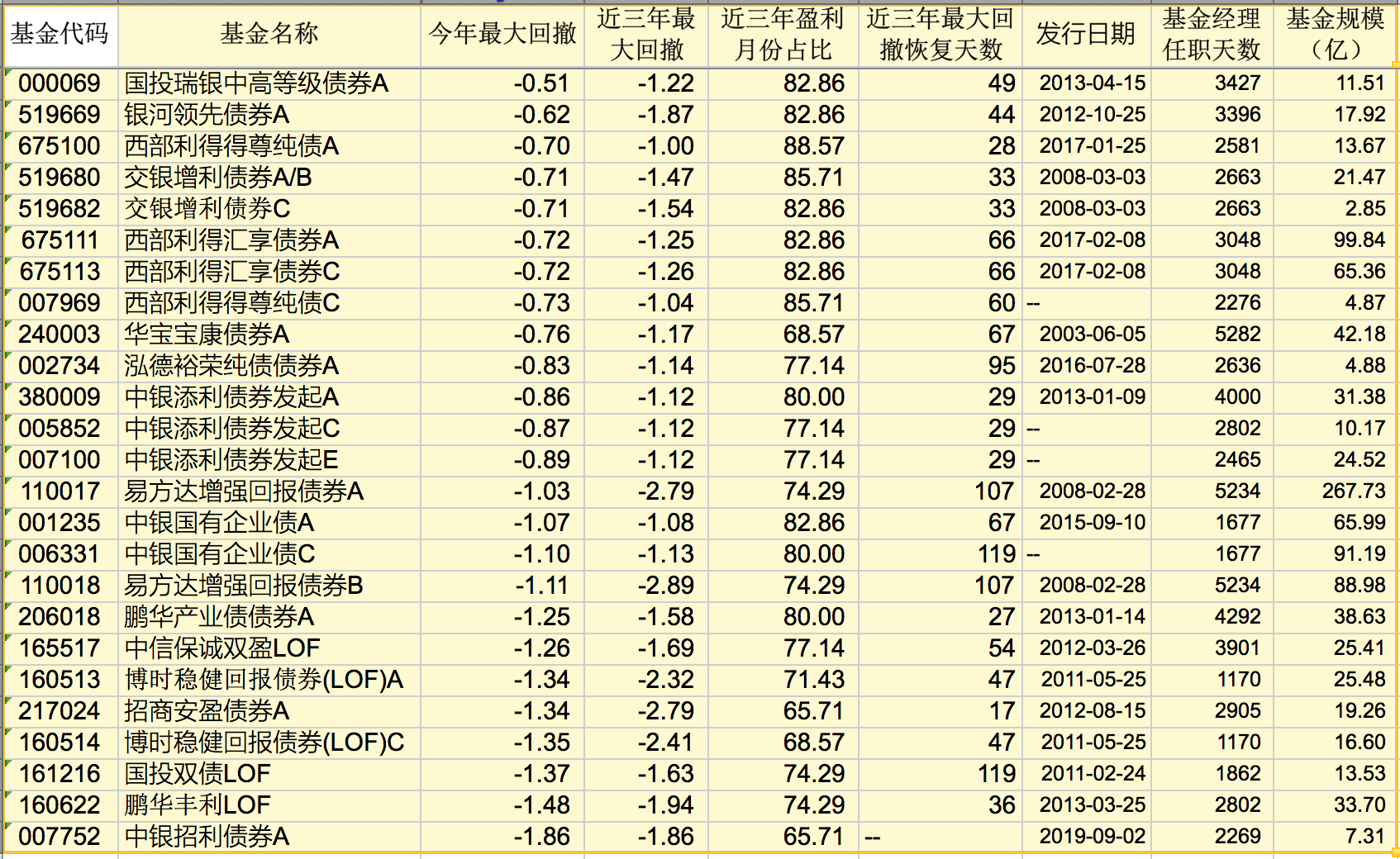 我个人相对比较推荐的基金是这几只,主要是综合基金盈利能力、回撤控制能力、基金公司规模、业绩稳定性等综合考量,供大家参考。我建议大家选债基优先选公司规模大的,这样万一有持仓债券暴雷,大厂也能悄悄兜底或在闪转腾挪,小厂就只能选择暴雷。