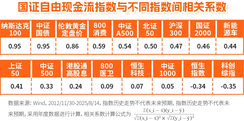 国证自由现金流指数仅与美股、中债、黄金等资产相关性较高,与A股各宽基、行业指数及港股则普遍存在低相关性甚至负相关性,其中国证自由现金流指数与恒生指数、科创综指的相关系数为负数。