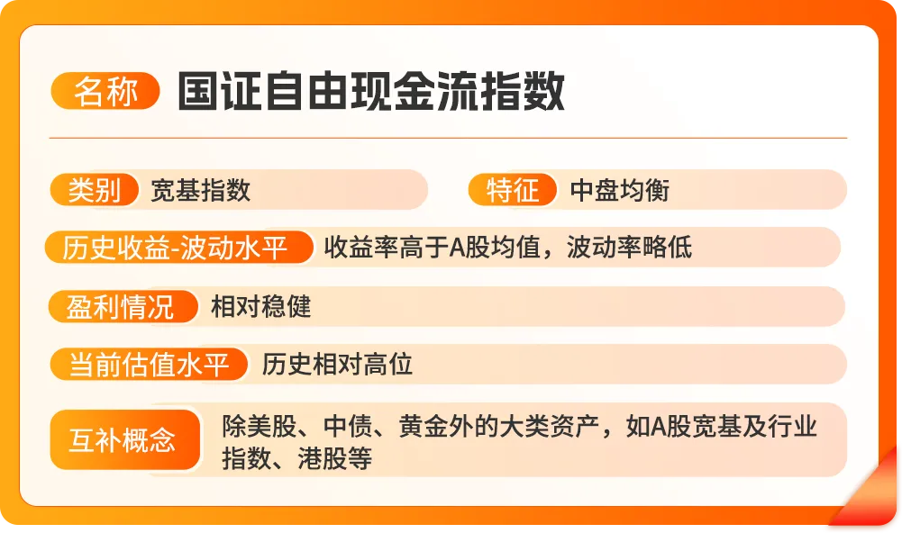 总结一下,国证自由现金流指数以企业的自由现金流为选择标准,反映企业真实的经营利润情况,并结合估值进行考虑,更客观地反映企业实际投资价值,由于自由现金流是上市公司分红的直接来源,因此该指数也具备一定的高股息属性。与传统的红利类指数对比,国证自由现金流指数的股息率稍低,但历史收益率有较大优势,且该指数在配置上与其他资产呈现出相对优秀的互补性。