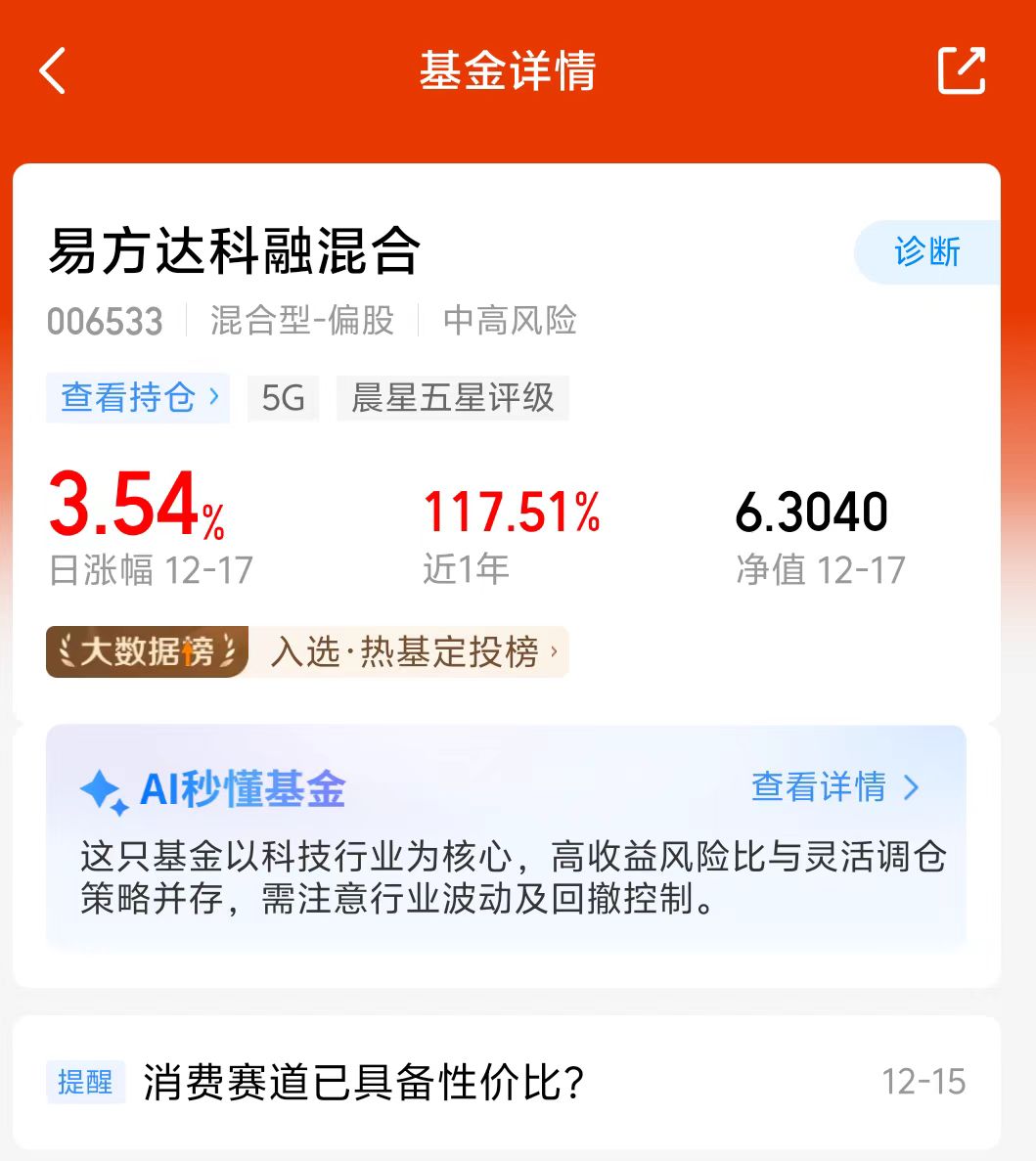 大盘今天震荡调整,三大指数涨跌不一,大科技等板块回调,近期各大板块轮动速度很快,单一行业风险比较大,易方达科融混合持仓有科技、新能源和军工等板块轮动配置,持仓比较均衡,近一年涨了117.51%,成立以来涨幅超500%,看好这个方向,我准备分批加仓了!