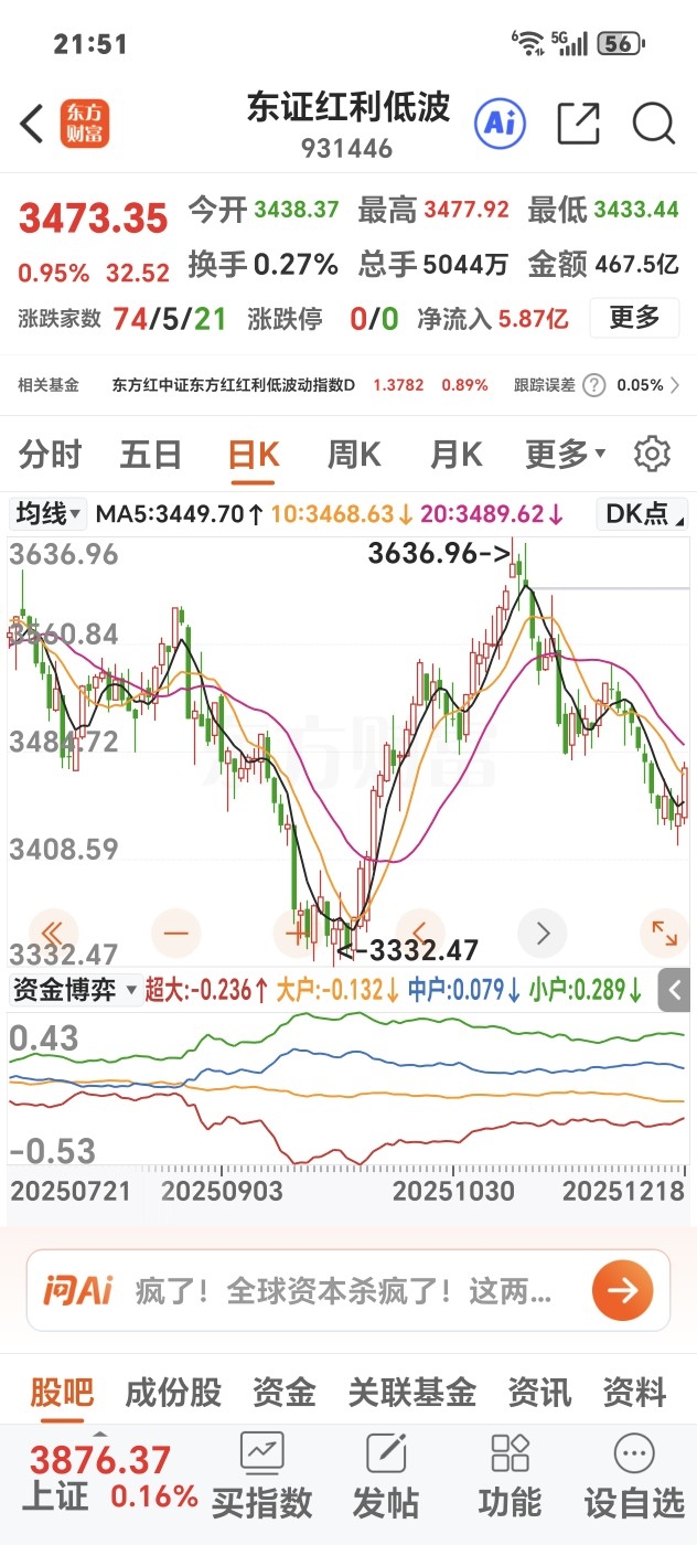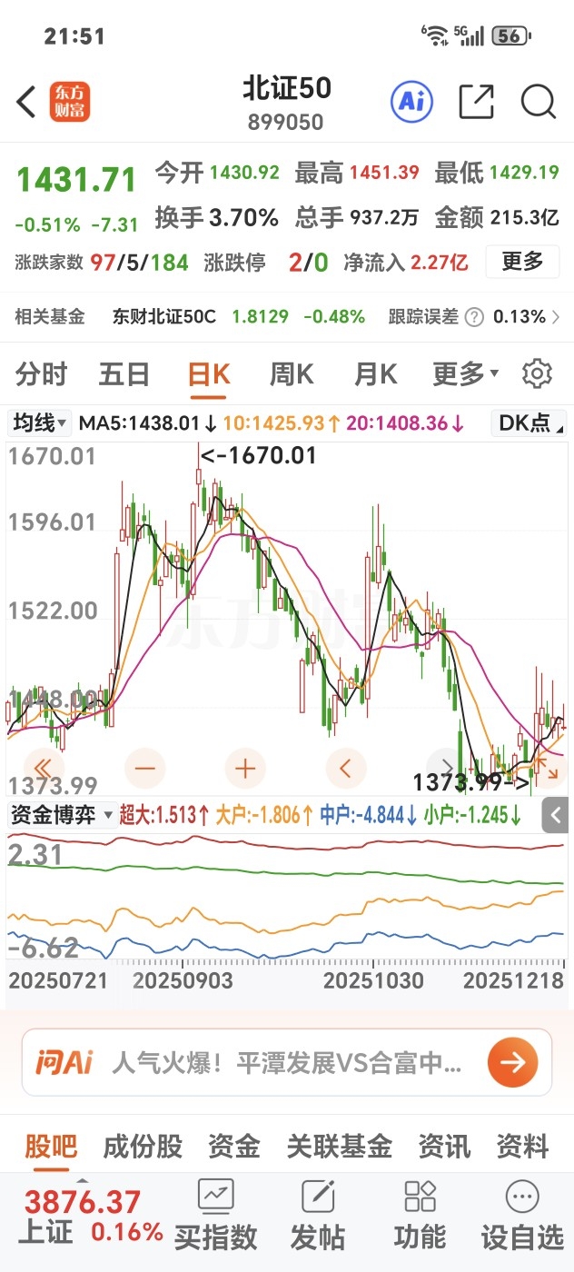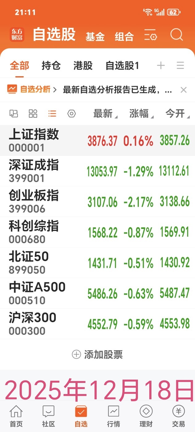 今天A股没有延续昨日的普涨行情,三大市场五只主要指数一涨四跌,其中上证指数上涨,其它四只下跌,创业板指跌幅最大,达到2.17%,K线图显示上证指数在今年8月中旬、深证成证、创业板指和科创综指在今年9月底形成了去年9月反弹以来的高点后,就一路震荡调整,目前看调整尚未结束,因此现在还应是多看少动,如仓位过低,加仓以北证50和红利低波为宜。