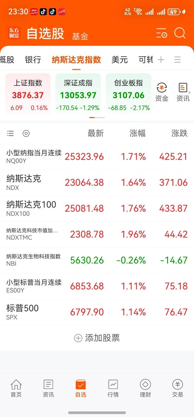 在今天晚上23点30分,目前观察美股纳斯达克100指数、纳斯达克科技市值加权指数