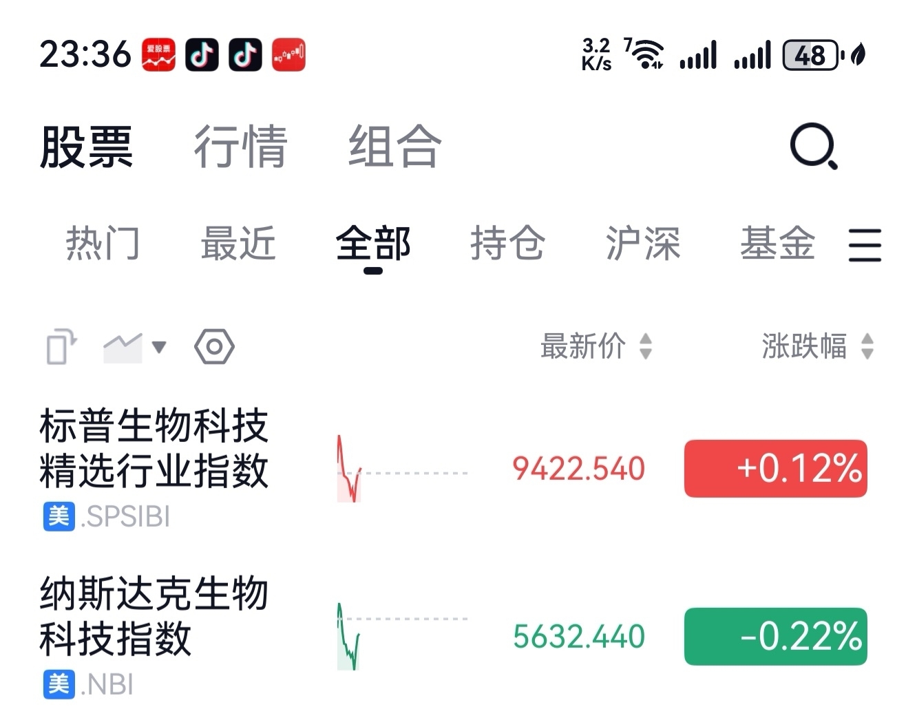 观察标普生物科技指数,在后半夜又再次跳水回落下来变跌-0.22%了。
