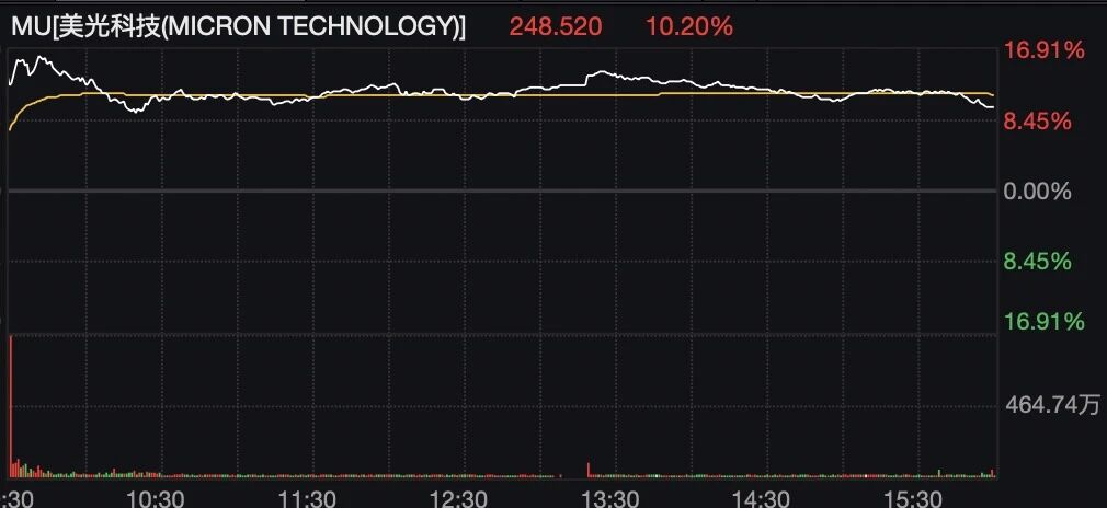 昨晚,前一晚盘后发布财报的美光科技,高开高走,最终收涨10.2%,领涨纳指100、标普500、纳指科技、费城半导体等所有指数的成分股。