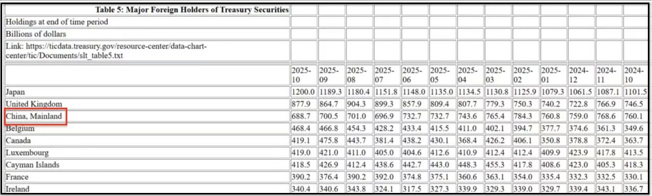 美国财政部公布了截至10月底,各国政府持有的美债规模,其中,下图,老钟持有的美债,从9月末的7005亿美刀,下降到了6887亿美刀,进一步下降了100亿+,而去年10月末持仓是7601亿,也即,最近一年,合计减持700亿美刀以上,由于最近一年美债价格涨幅不错,因此,实际减持的规模,要比账面数据还多一些。