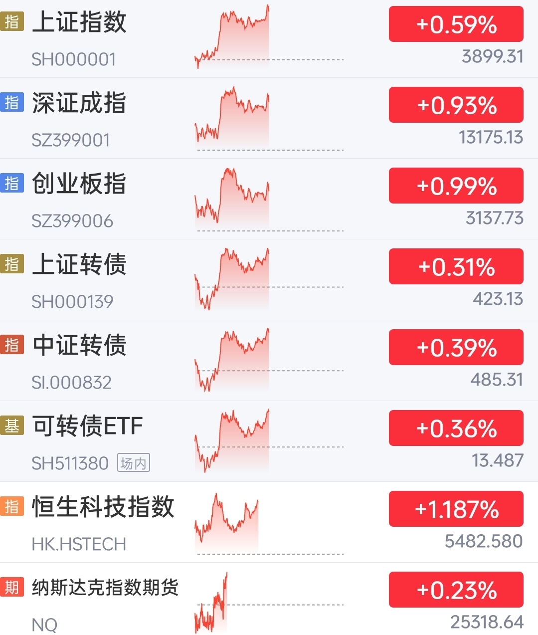 截止到午间收盘三大指数全红:上证指数+0.59%,深证成指+0.93%,创业板指+0.99%,转债晴天,恒科晴天,纳指期货小红!马上就要过年了,又逢月底,个人打算安安稳稳过年,所以今天上个稳健的,另外纳指继续保持定投,其他不动!目前七层仓,要求不高,能赚个零花就行!