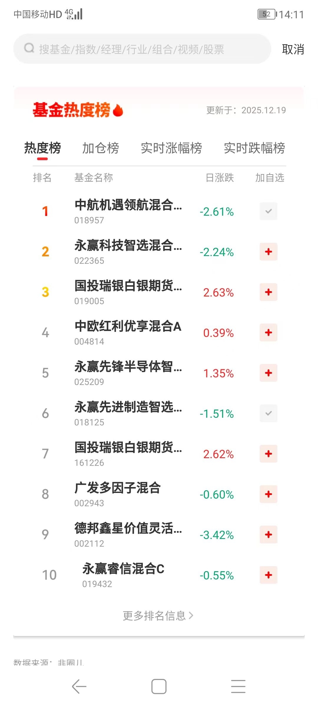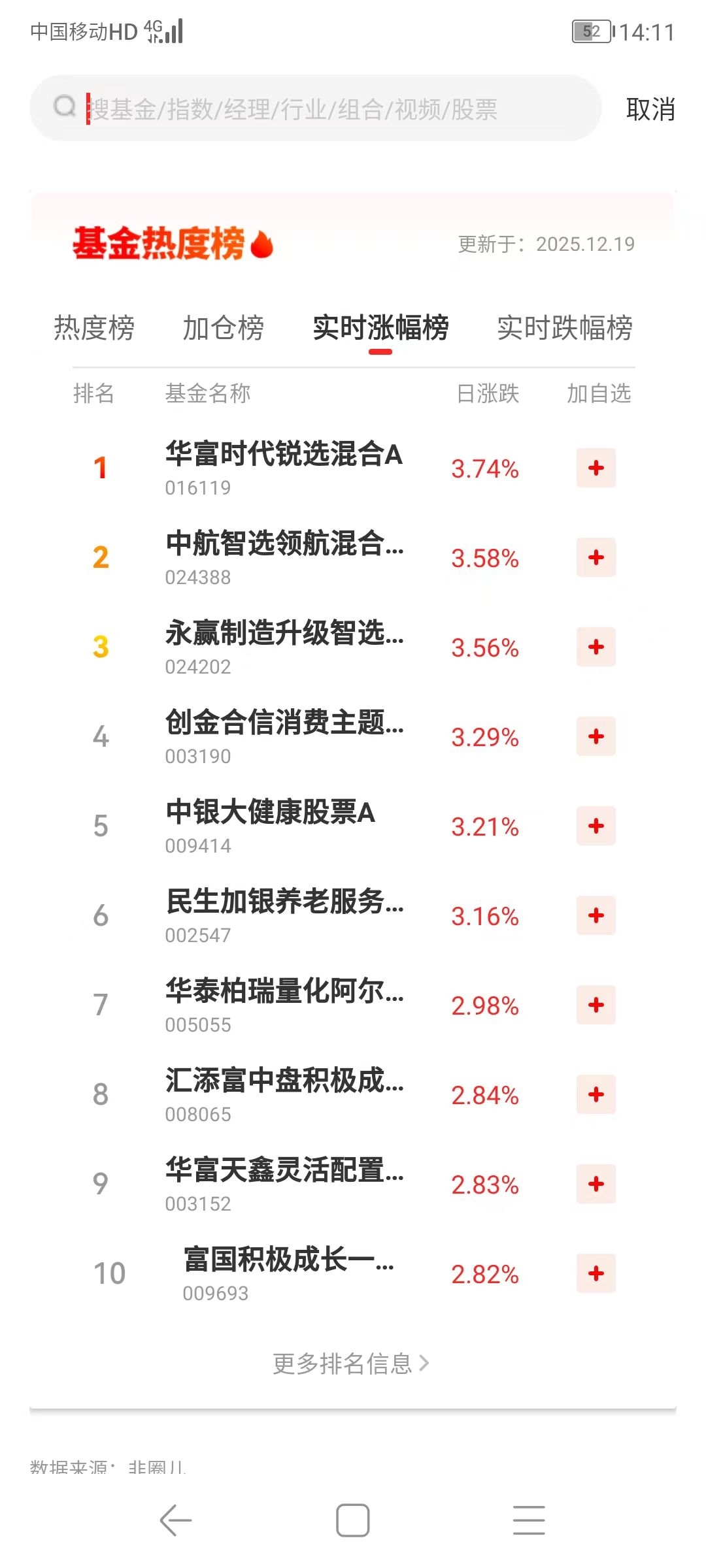 12月19日基金热度榜,加仓榜,实时涨跌幅榜