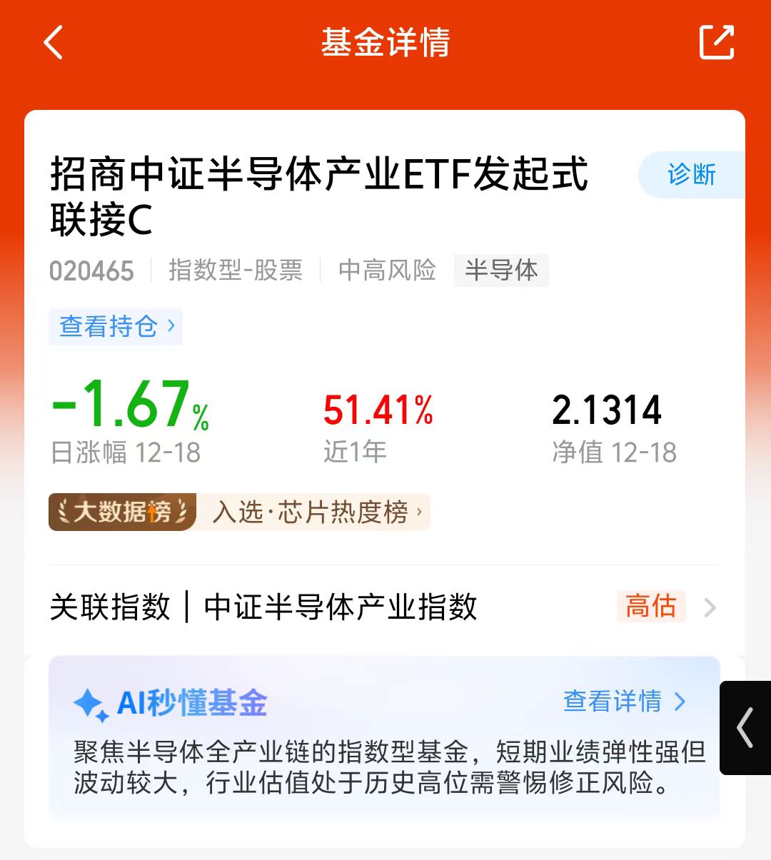 大盘今天回暖上涨,半导体今天盘中拉升涨超1%,长期看好半导体设备板块,$招商中证半导体产业ETF发起式联接C(OTCFUND|020465)$持仓聚焦半导体全产业链,成份股聚焦北方华创、中微公司、中芯国际等细分领域龙头,近一年涨了51.41%,看好这个方向,我准备分批布局!