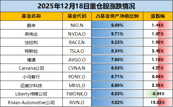 【十大持仓】根据最新披露的基金定期报告,截至2025年三季度末,华宝海外新能源汽车前十大重仓股包括蔚来、英伟达、法拉利、博通、特斯拉、Carvana公司、小马智行、迈威尔科技、Liberty传媒公司、Rivian Automotive公司,占基金资产净值比例合计为75.42%。