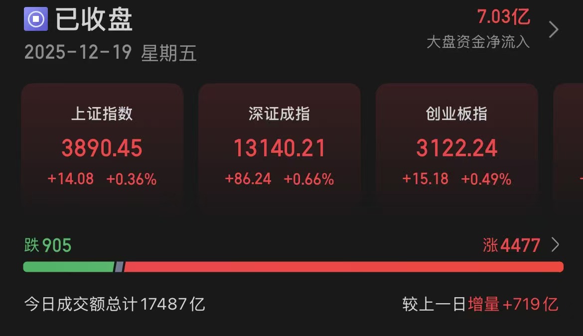 指数表现,沪指上涨0.36%,深成指上涨0.66%,创业板指上涨0.49%。个股涨多跌少,全市场4477只个股上涨,下跌个股905只。沪深京市场全天成交额1.74万亿,较上个交易日增量719亿。