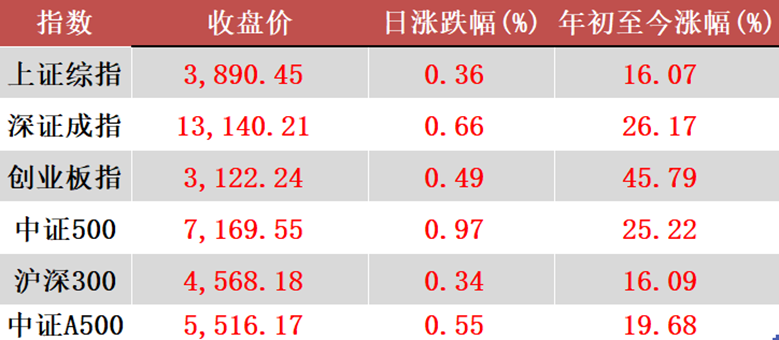 国内主要股指普涨。截至收盘,上证指数涨0.36%,收报3890.45点;深成指涨0.66%,报13140.21点;创业板指数涨0.49%,收报3122.24点。两市成交额17259亿元。行业方面,申万一级涨多跌少,商贸零售领涨,涨幅为3.66%;银行领跌,跌幅为0.44%。