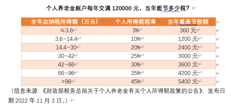 2) 递延纳税优惠:有阶梯制的递延纳税优惠,总体力度还蛮大。举例来说,如果全年应纳税所得额在30万以上,年交12000元当年可节税至少3000元,大家可以参照自己的收入来自由选择。在领取环节,个人领取的个人养老金,不并入综合所得,单独按照3%的税率计算缴纳个人所得税,其缴纳的税款计入“工资、薪金所得”项目。