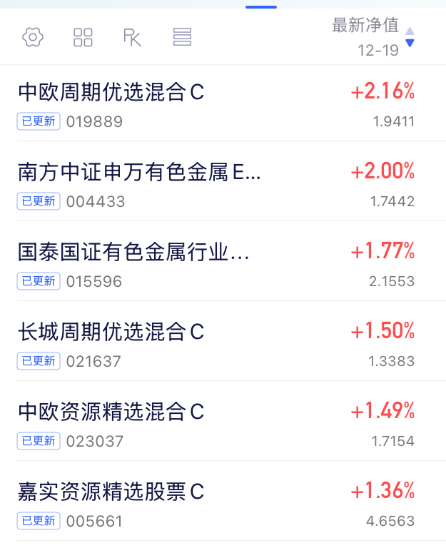 今天权益市场全面回暖,三大指数集体飘红,从板块方面来看,有色金属盘中表现活跃,今晚相关基涨幅均不错,具体来看净值更新情况: