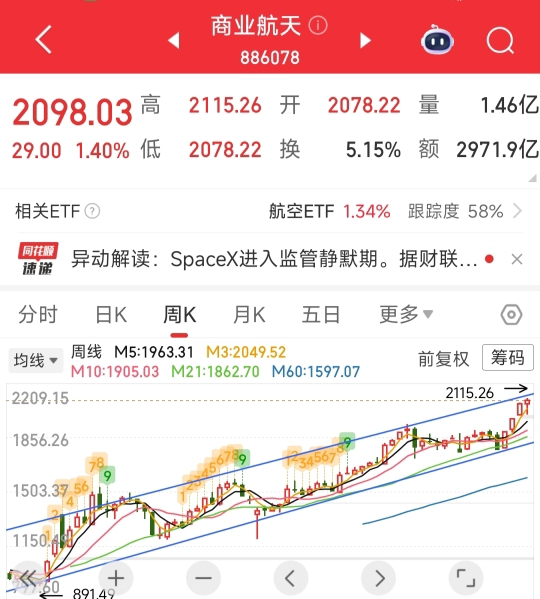 今天商业航天 卫星 又长了,超预期。这条线会不会成为明年的主线,太热了,现在周线有点高了,有点恐高,目前趋势很漂亮,就是已经走高了,不知道会不会突破,后面在看情况。