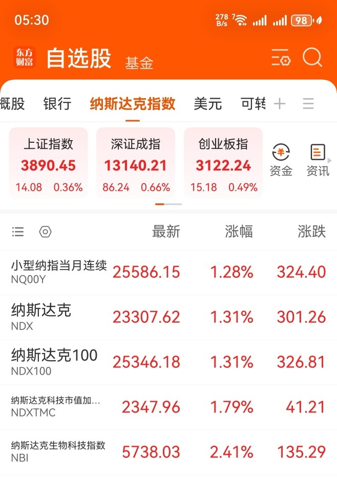 在今天周六早上,观察美股纳斯达克100指数、纳斯达克科技市值加权指数、标普生物科