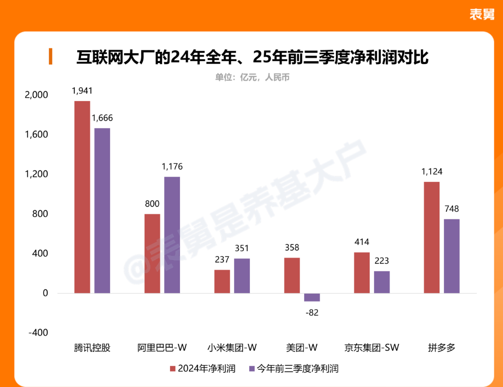 下图,我帮大家把腾讯、阿里、小米、美团、京东、拼多多这6家的24年全年净利润、25年前三季度净利润拉了一下,大家可以对比一下。