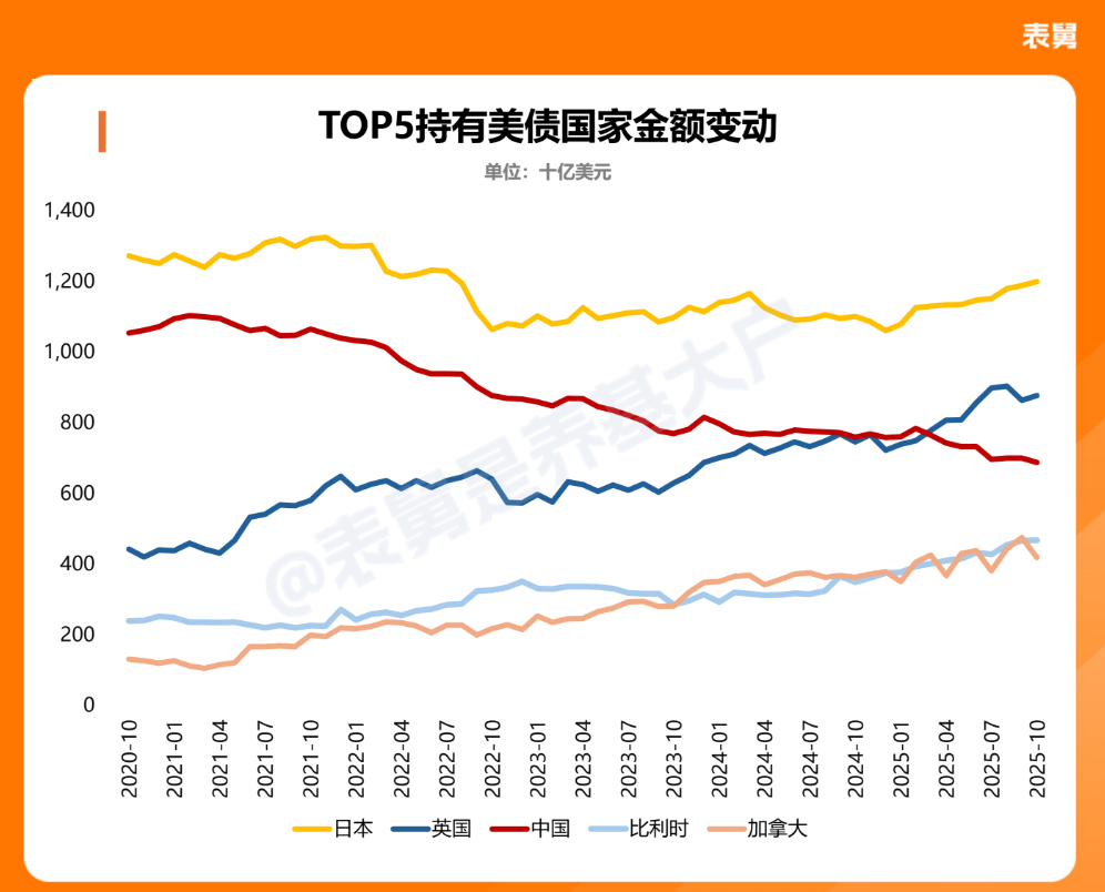 下图,是持仓美债最大的5个国家,日本、英国、中国、比利时(欧盟总部所在地)、加拿大,最近5年的持债规模变化,可以看到,除老钟以外,其他四国是一直在增持的,这也是为何贝森特说,美债的投标需求是不错的,外国政府的买债需求比较踊跃。