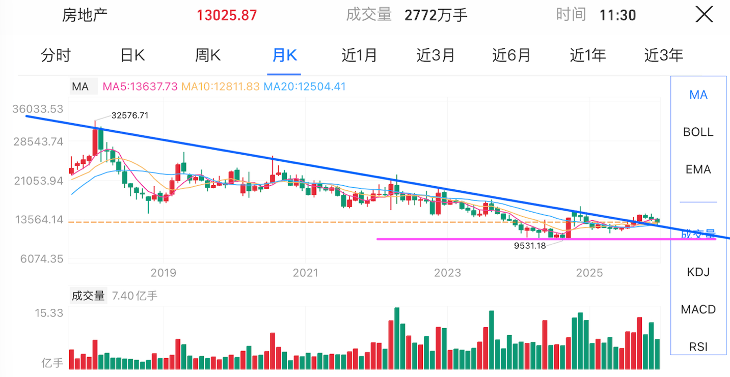 参考房地产指数月K线图,技术面正释放出强烈的见底回升信号: