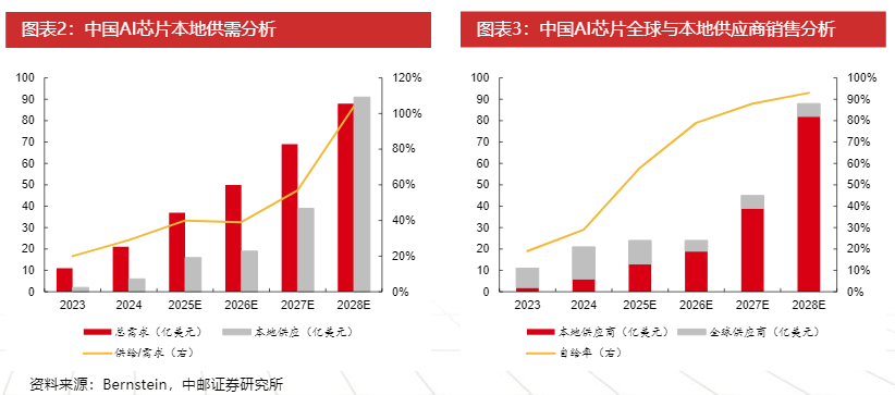 技术自主创新带动国产算力芯片自给率逐步提升。根据Bernstein预测,2025年我国本地芯片总需求与本地产能分别为370、160亿元,供给/需求为40%,而到2028年,本地芯片总需求与本地产能分别为880、910亿元,供给/需求为104%;2025年我国芯片自给率仅为58%,而2028年或达93%。