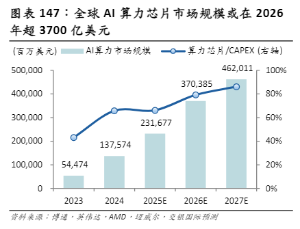 AI技术进步也驱动企业真金白银的基础设施投资,AI算力芯片需求强劲。科技巨头的资本开支在2025年达到了前所未有的规模,海外主要云厂商年度资本开支总额预计超过3000亿美元,其中绝大部分投向了数据中心建设和AI芯片采购。中国AI科技龙头亦同步加速资本投入!交银国际预测全球AI算力芯片市场规模或在2026年超3700亿美元,2027年超4600亿美元。
