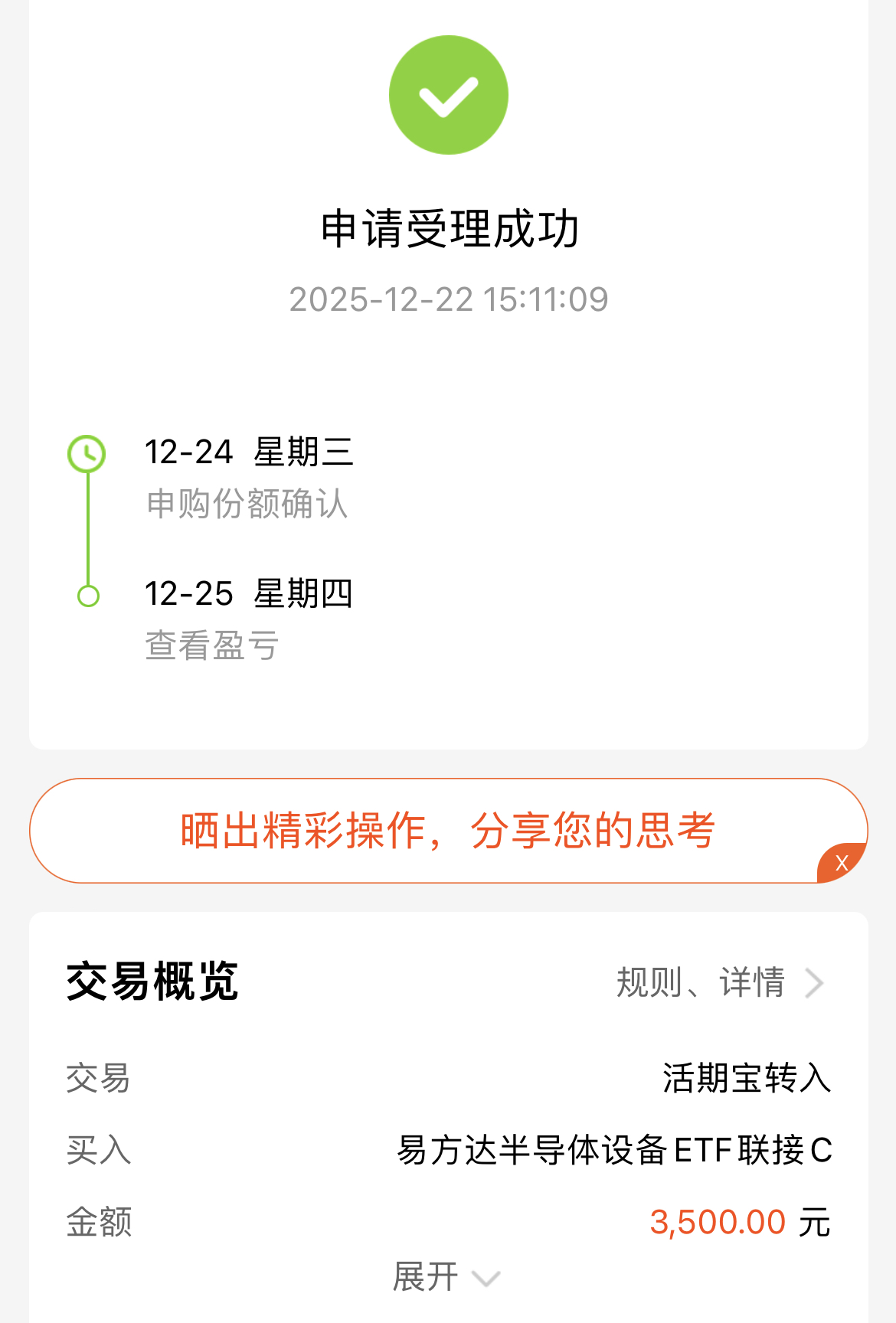 今日大盘回暖势头超猛,三大指数高开高走,个股反弹节奏不停,半导体设备板块更是领涨全场。在AI发展和国产替代的双重驱动下,不少设备龙头股价创下历史新高,大摩也持续看好芯片长期牛市行情。我也打算加点仓位,国产替代+扩产加速的利好还在发酵,行业成长逻辑扎实,趁着行情向好继续定投,看好后续板块走出强势行情!