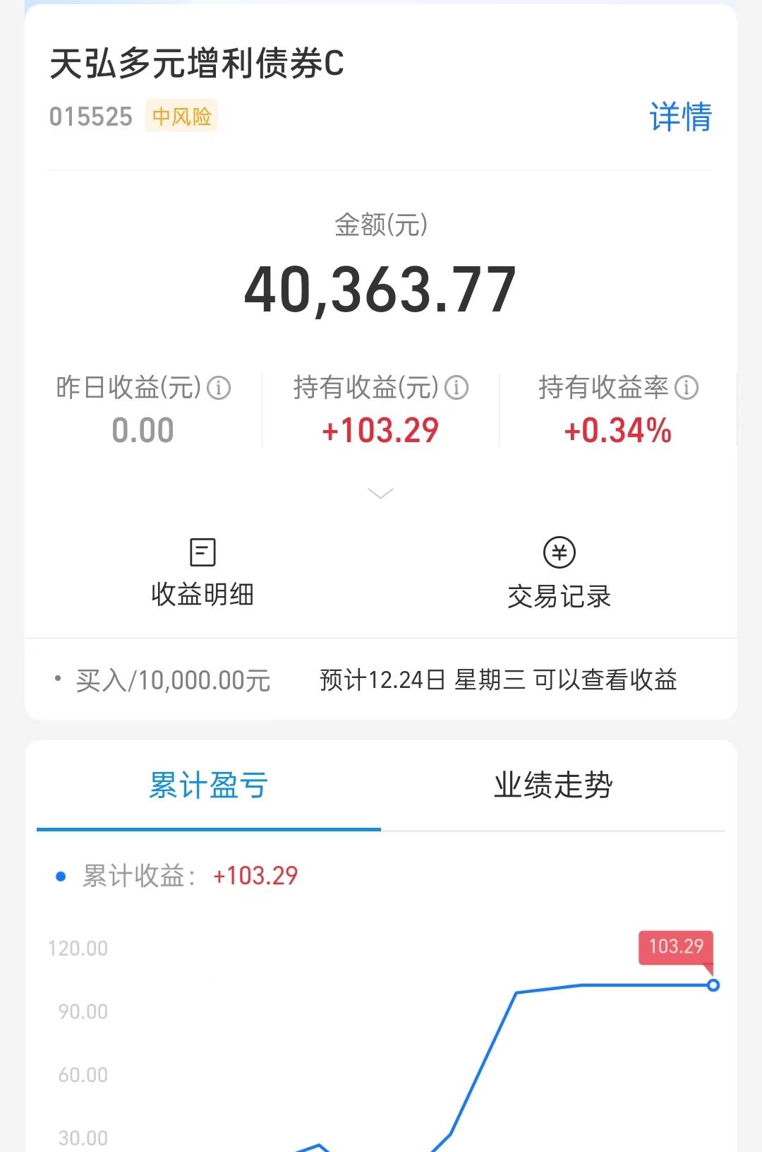 目前银行红利板块小幅下跌,我趁机再低吸1次天弘多元增利债券C。这只基金我是分批低吸布局的,目前干到了4万了。这个前面我在低位布局了一些,体验挺好的。它主要是走势比较稳。连续3天收蛋了,上周五收了2个蛋,前面一天收了33个蛋,再前面一天收了15个蛋,3天累计收了50个蛋,我觉得挺不错的。目前我已经收了103元了。近1年收益率6.48%,比普通纯债基和定存多不少。