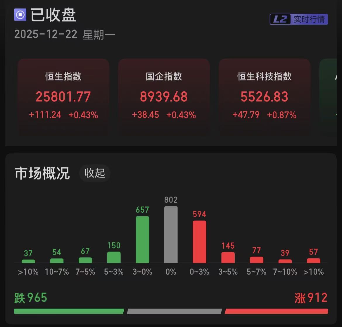 恒生指数上涨0.43%,国企指数上涨0.43%,恒生科技指数上涨0.87%。912只个股上涨,965只个股下跌。南向资金,净流入31.25亿港元。