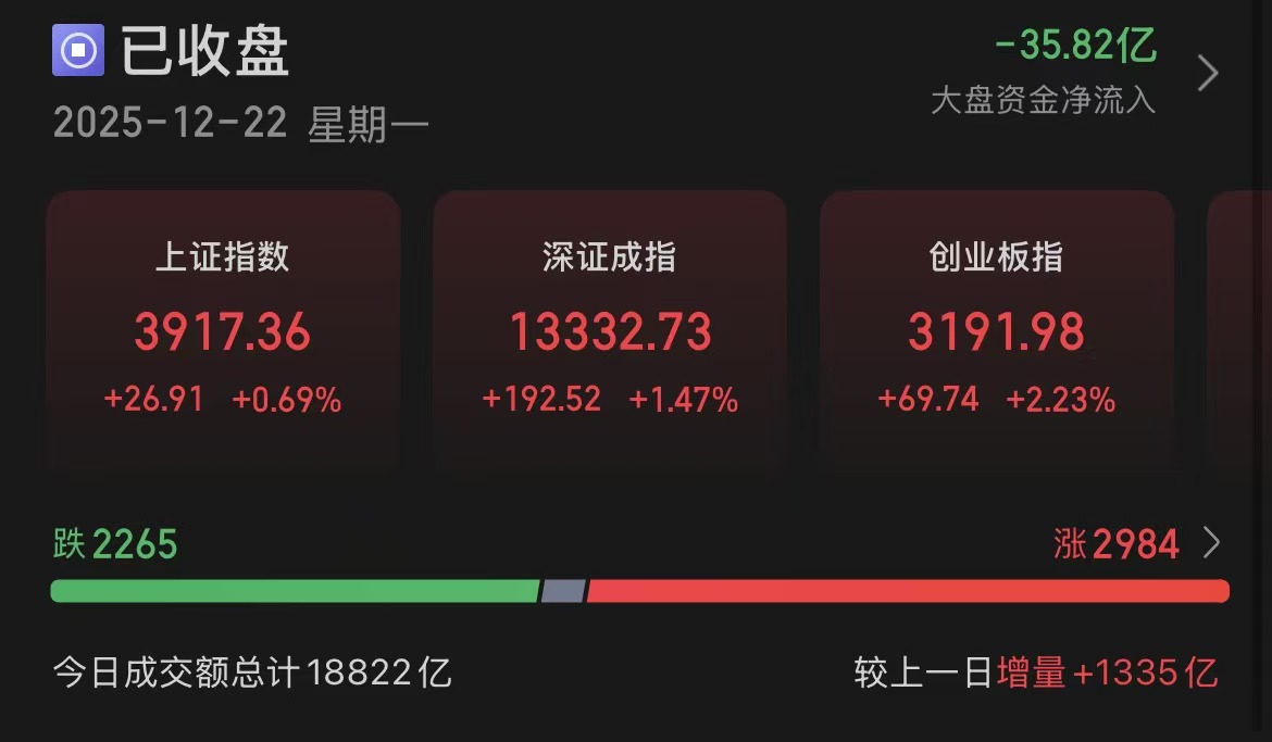 指数表现,沪指上涨0.69%,深成指上涨1.47%,创业板指上涨2.23%。个股涨多跌少,全市场2984只个股上涨,下跌个股2265只。沪深京市场全天成交额1.88万亿,较上个交易日增量1335亿。