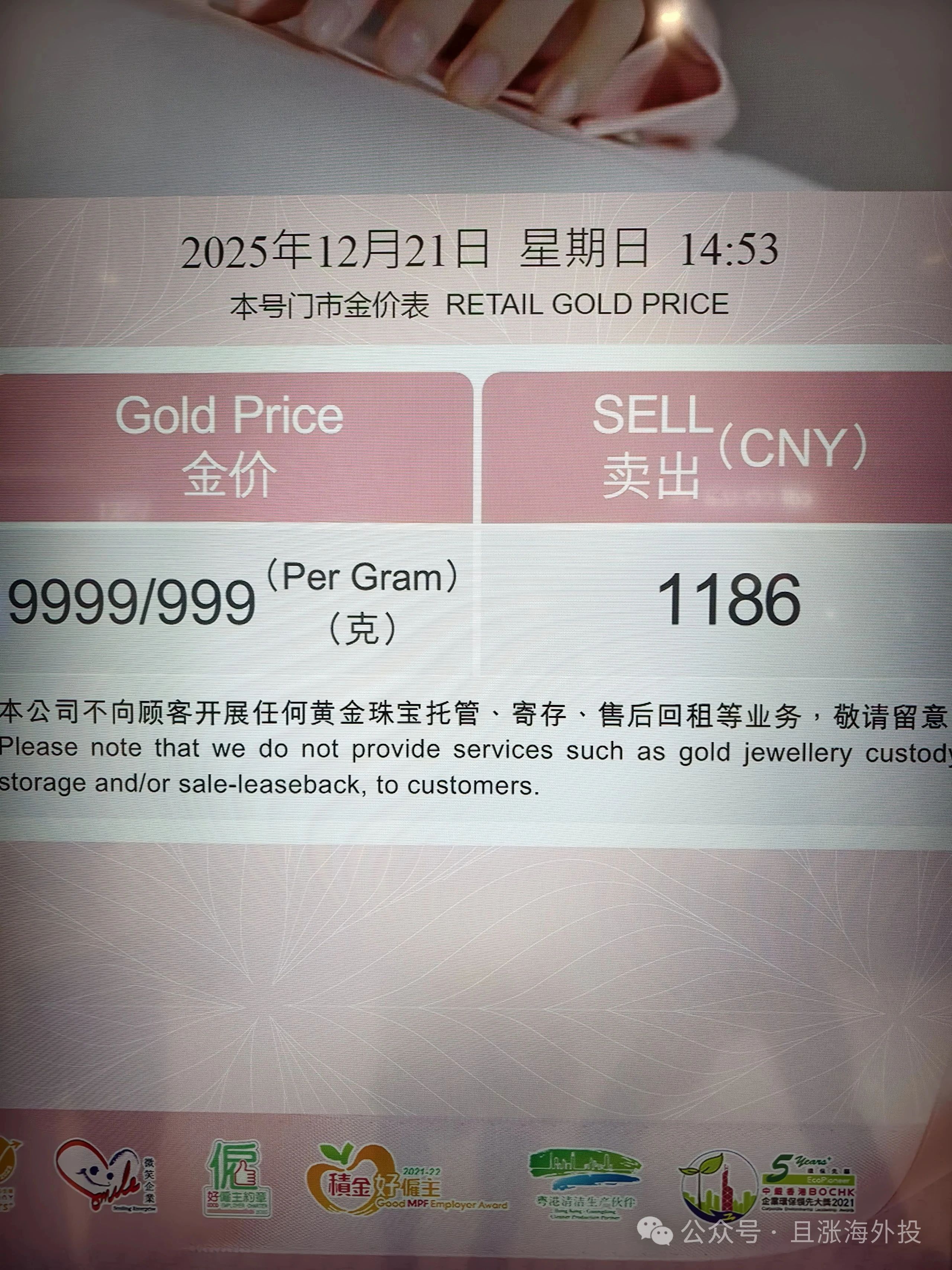 另外就是金价,最近两年有在陆续购金,之前两次分别在香港和水贝买的,这次在B区的周大福,当日金价1186左右,比内地金价便宜接近200块,看了下和香港周大福挂牌价(HKD)汇率换算成人民币的价格差不多。所以果断买了个手镯,比内地整体便宜3000多。