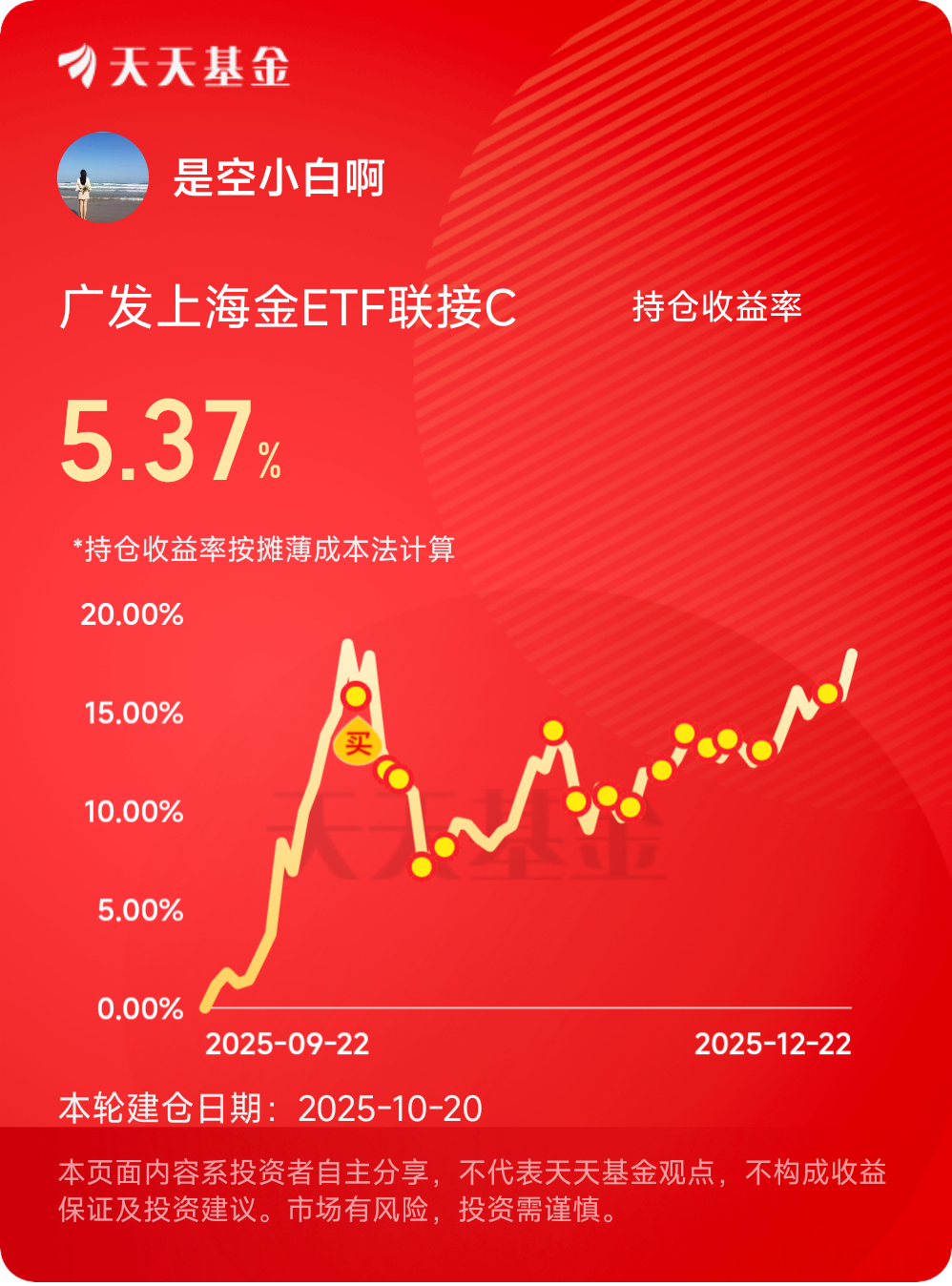 $广发上海金ETF联接C$ 也太牛了!又创新高了,基金近1年涨60.18%、近3年涨123.64%,拿在手里收益肉眼可见地涨,现在我都赚5个多点了,接着拿准没错。