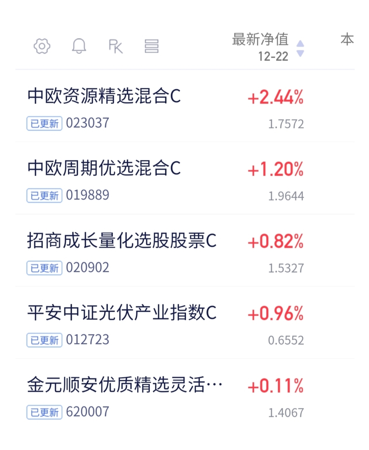 我持有的几只基金今天都有不错的表现:中欧资源精选混合C涨了2.44%,这个涨幅相当亮眼;中欧周期资源优选混合C也上涨了1.20%,表现稳定。另外几只基金也有小幅上涨,招商成长量化选股股票C涨0.82%,平安中证光伏产业指数C涨0.96%,金元顺安优质精选混合A微涨0.11%。