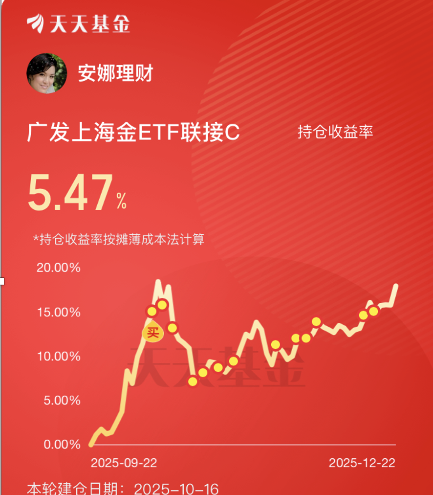 今日又是收鸡腿的一天!持有$广发上海金ETF联接C$ 单日收益稳稳上涨1.86%,累计持仓收益已达5.47%。