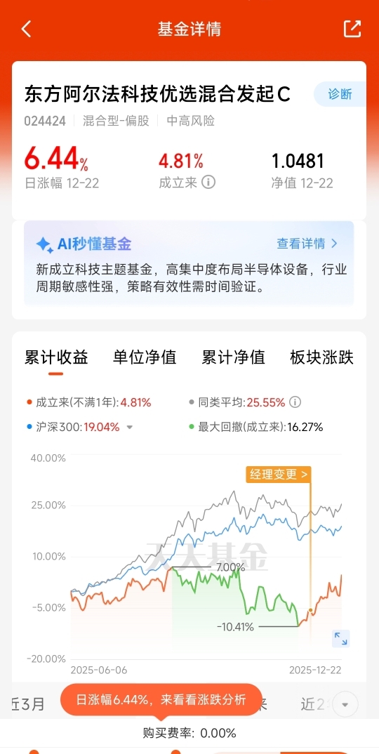 #2025年 你的投资战绩如何?# 我的战绩还是不错的,主要是跟着大科技的节奏走,才有好的收益,看着半导体设备表现优秀,阿尔法科技优选持仓都是含有半导体设备优质标的企业,也难怪能涨6.44%又跑在同类前面呢