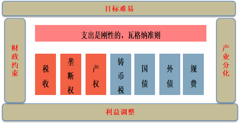 制度经济学派认为政府是一个将外部性内部化的组织,广义财政则被定义为保证这一组织正常运行的金融手段,财政状况决定了政府的运行轨迹。当政府正常税收等内部资金不足以应对其公共支出,并且通过发债、铸币税或者收费亦不能满足时,政府往往出让垄断权。在穷则思变的逻辑下,政府通过放权来完成负债扩张的接力。一方面,让市场来解决市场的问题,通过供给创造来引导消费需求,通过让渡权利来吸引非公有资本接手供给创造。另一方面,政府保留下公共资金以防范公共的风险,这一过程是目标、领导者与财政约束的动态博弈。