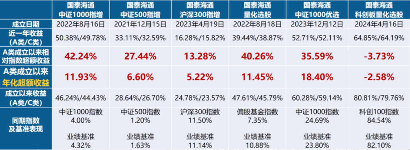 数据来源:Wind、国泰海通资管;业绩经托管复核,截至2025.09.30。基金的过往业绩不预示其未来表现,基金管理人管理的其他基金的业绩并不构成基金业绩表现的保证。基金取得超额收益不代表一定取得正收益。国泰海通中证1000指数增强A/C类2022.8.16成立,成立以来收益为46.24%/44.43%,同期业绩比较基准为4.32%,同期中证1000指数为4.00%;2022年度收益为-9.49%/-9.63%,同期业绩比较基准为-13.06%;2023年度收益为2.56%/2.17%,同期业绩比较基准为-5.91%; 2024年收益为13.54%/13.08%,同期业绩比较基准为1.41%。国泰海通沪深300指数增强A/C类2023.4.19成立,成立以来收益为24.78%/23.57%,同期业绩比较基准11.14%,同期沪深300指数11.50%;2023年度收益为-11.60%/-11.85%,同期业绩比较基准为-16.73%; 2024年收益为19.24%/18.77%,同期业绩比较基准为14.04%。国泰海通中证500指数增强A/C类2021.12.15成立,成立以来收益为28.64%/26.70%,同期业绩比较基准1.63%,同期中证500指数1.20%;2021年度收益为1.49%/1.47%,同期业绩比较基准为0.46%;2022年度收益为-11.34%/-11.70%,同期业绩比较基准为-19.30%;2023年度收益为-2.60%/-2.98%,同期业绩比较基准为-7.01%; 2024年收益为11.41%/10.95,同期业绩比较基准为5.40%。国泰海通量化选股A/C类2022.8.18成立,成立以来收益为47.61%/45.79%,同期业绩比较基准10.88%,同期偏股基金指数7.35%;2022年度收益为-4.95%/-5.09%,同期业绩比较基准为-8.15%;2023年度收益为8.33%/7.91%,同期业绩比较基准为-5.16%; 2024年收益为7.37%/6.94%,同期业绩比较基准为7.49%。国泰海通中证1000优选A/C类2023.12.12成立,成立以来收益为60.28%/59.14%,同期业绩比较基准为23.80%,同期中证1000指数为24.69%;2024年收益为14.68%/14.22%,同期业绩比较基准为1.41%。国泰海通科创板量化选股2024.4.16成立,成立以来收益为80.81%/79.76%,同期业绩比较基准为82.10%,同期科创100指数为84.54%;2024年收益为17.38%/17.04%,同期业绩比较基准为22.07%。国泰海通红利量化选股2024.10.30成立,成立以来收益为7.74%/7.34%,同期业绩比较基准为1.38%;国泰海通中证A500指增2024.12.17成立,成立以来收益为26.09%/25.70%,同期业绩比较基准为20.58%;国泰海通上证科创板综合价格指数增强2025.4.17成立,成立未满六个月,业绩不予展示。排名数据来源:银河证券,截至2025年9月26日;基金的过往业绩不预示其未来表现,基金管理人管理的其他基金的业绩并不构成基金业绩表现的保证。基金取得超额收益不代表一定取得正收益。注:近一年时间区间2024.9.27-2025.9.26,近两年时间区间2023.9.27-2025.9.26,近三年时间区间2022.9.27-2025.9.26。 国泰海通中证1000指增A、国泰海通中证500指增A、国泰海通沪深300指增A所属基金分类为1.5.1 增强规模指数股票型基金(A类),国泰海通量化选股A所属基金分类为2.1.1 偏股型基金(股票上下限60%-95%)(A类),国泰海通中证1000优选A、国泰海通科创板量化选股A所属基金分类为1.1.1 股票基金-标准股票型基金-标准股票型基金(A类)。国泰海通中证500指增近三年排名为6/49;国泰海通中证1000指增近三年排名1/13。