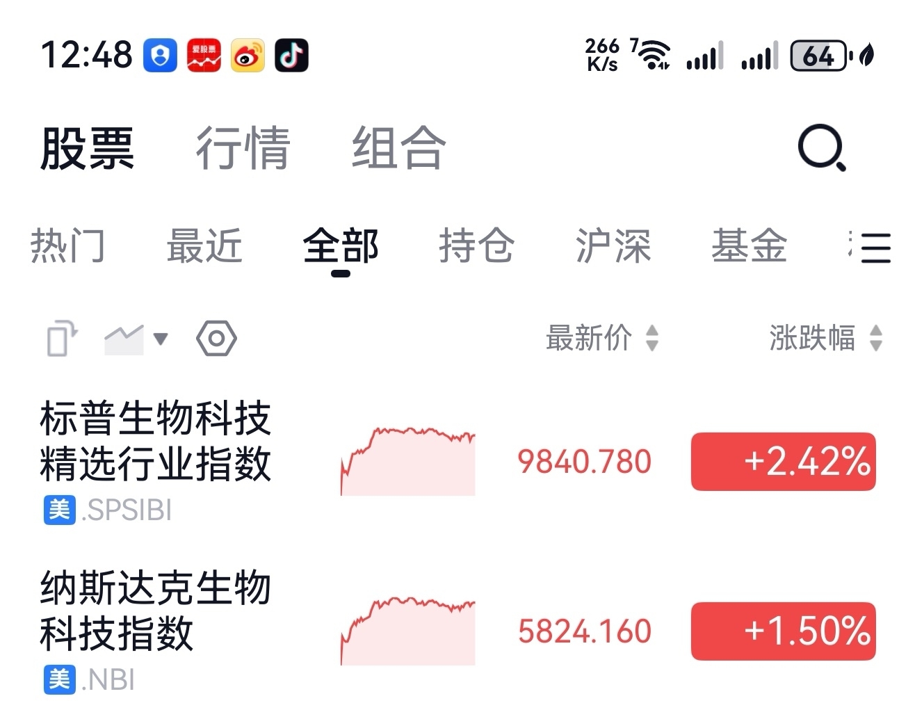 尤其观察纳斯达克生物科技指数、标普生物科技指数,在最近这两天表现,明显是比纳斯达克指数科技行情表现要好一些的。