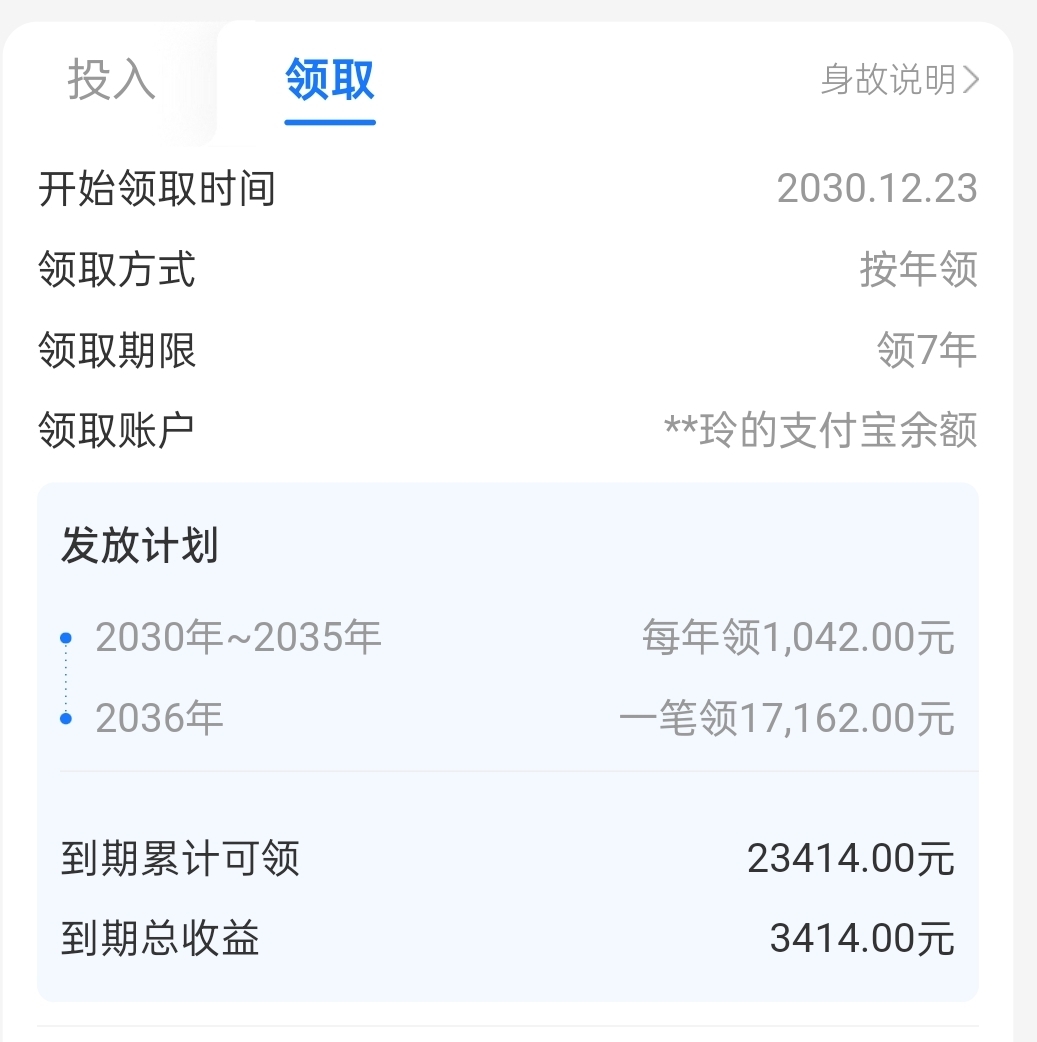 "现在市场行情多变,为了给自己的未来一个保障,经过多方面考虑还是选择可以锁定收益的方向!免得之后银行利率下调,给自己带来不必要的损失,经过筛查后发现 【长钱保·五年领年金】 比较适合我这样的普通人!先来看看这个方向都有什么优势…… 第一,收益写进合同,给未来一个确定的底气。 比如我现在一次性投入2万元,从第5年开始,每年固定领取1042元,连续6年,期满后直接领取剩余的17162,总共能拿到23414元,等于这样下来赚了3414元。领多少钱投入的时候就可以看的到,到期保证领取。虽然收益不算很高,但它胜在稳定,不管市场怎么变化,该给咱的一分不少都会给。 第二,门槛低,普通人也能轻松参与。 支持月交、年交和一次性趸交,最低每月100元就能起投,不会对日常生活开销造成负担。即便是普通打工人,也能通过这种方式慢慢攒下一份属于自己的小金库。 第三,第5年就能开始领取,周期短。 不像很多年金要等到退休才能动用,这款从第5年起就能领取年金。五年说起来时间也不算太久,眨眼就过,那时候孩子正好也长大了,慢慢的领取,这样自己的压力也不会很大! 经过多方面考虑,小师妹决定继续投【长钱保·五年领年金】一笔(想了解点蓝色字体就可以跳转),领取的方式也是特别简单,提前就可以设置领取转入支付宝余额或者银行卡!今天继续给自己的未来投一笔备用金!"