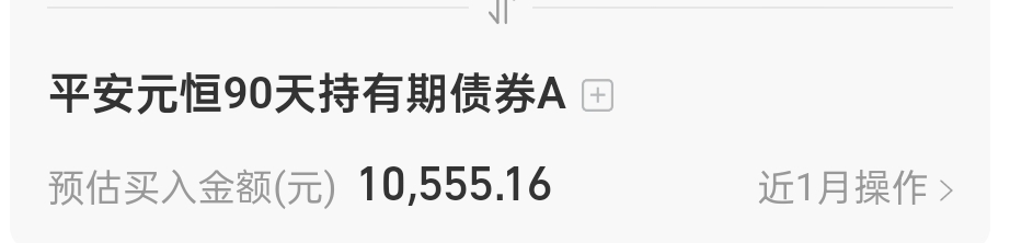 $平安元恒90天持有债券A$ +10000 债市行情好转,利率债拉升不少,信用债也比较平稳,今天继续向稳健方向发车10000。这是一只中短债基金,有90天的持有期,时间不长不短,刚好能帮我管住手,不让自己频繁操作,免得错过上涨行情。最近市场波动有点多,我还是觉得把大头放在稳健的地方更踏实。这支基不管是短期还是长期表现都挺稳,近一年年化收益3.61%,稳稳跑赢同类平均水平。更关键的是,它回撤特别小,近一年最大回撤才0.22%,风控能力出色,拿着安心。它的风格也很符合我对稳健理财的需求。今天个人继续加仓了一笔,稳稳的才安心。