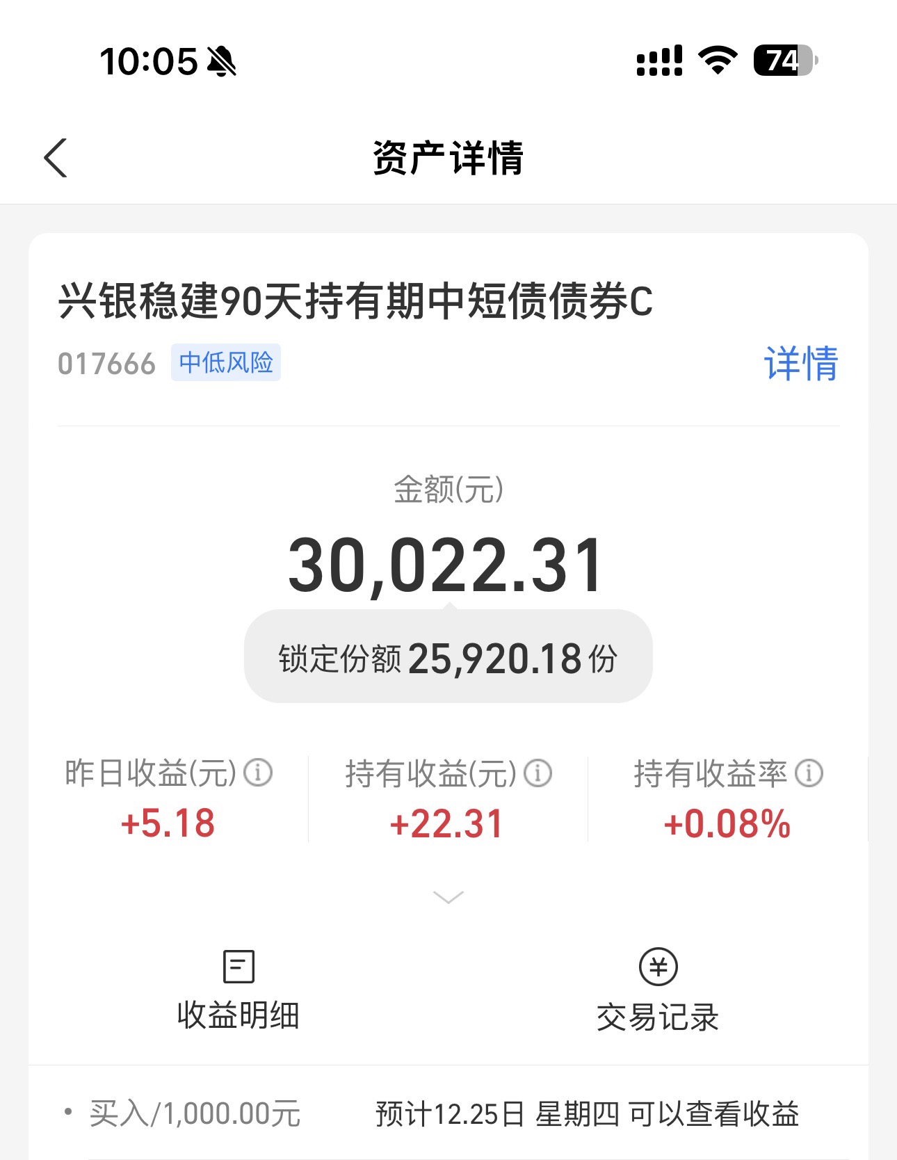 $兴银合泰债券C$ :小王今日继续上车3000,目前我已经开启了周定投上车的模式,说明我对该基金长期表现的充分认可。在我看来,这只基金最亮眼的特质就是“稳”字当头——不仅回撤幅度小,收益表现亮眼,更具备极强的回撤修复能力,这样兼顾回撤和好收益的基金,目前也是成为我的重仓之一啦;小王从最新的三季度持仓来看,兴银合泰债券C属于中长债基金,持仓以金融债和短期融资债为主,同时借助杠杆策略进一步增厚收益。基金经理在短久期信用债领域颇具挖掘能力,我也信任基金经理的能力;并且拉开长期收益来看:该基金近一年收益率达1.83%,又因为目前该基金处于回撤修复期,所以小王今日继续上车的一笔我的重仓基金