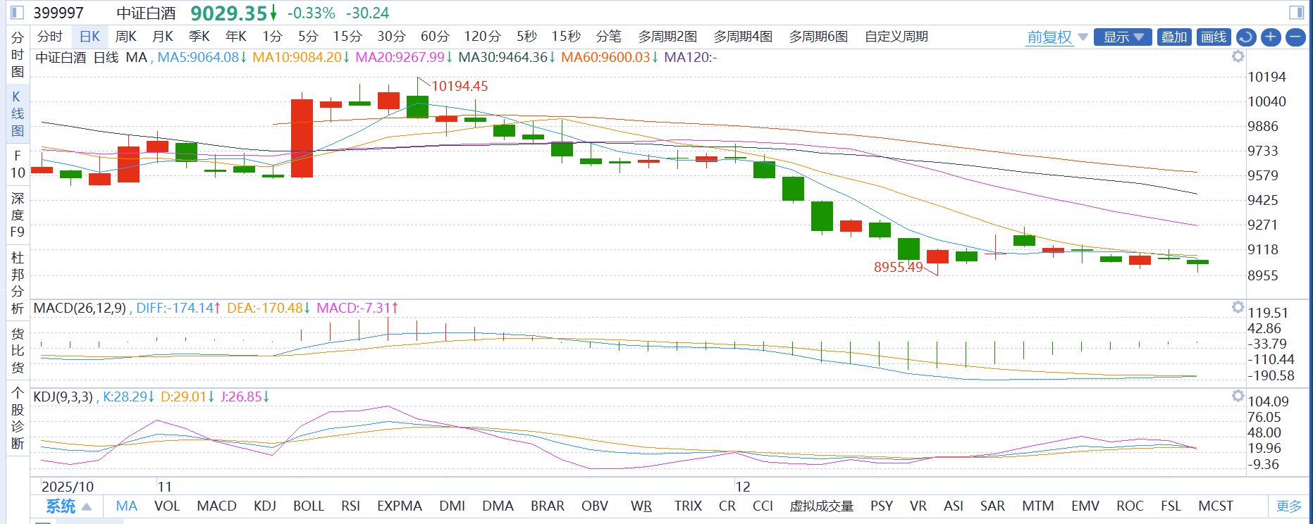 白酒板块:K线依然被多条均线压制,MACD在0轴下方死叉运行。资金都去抢新能源和科技了,白酒这边的流动性明显枯竭。
