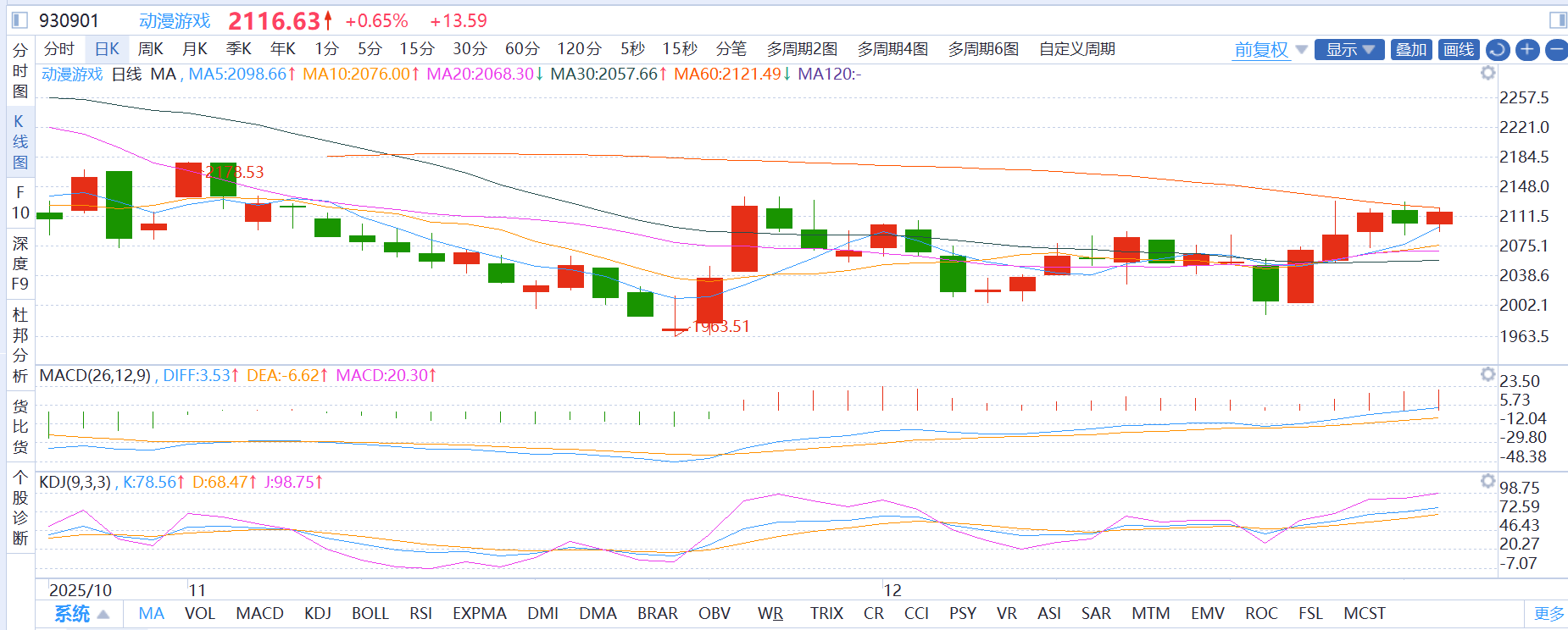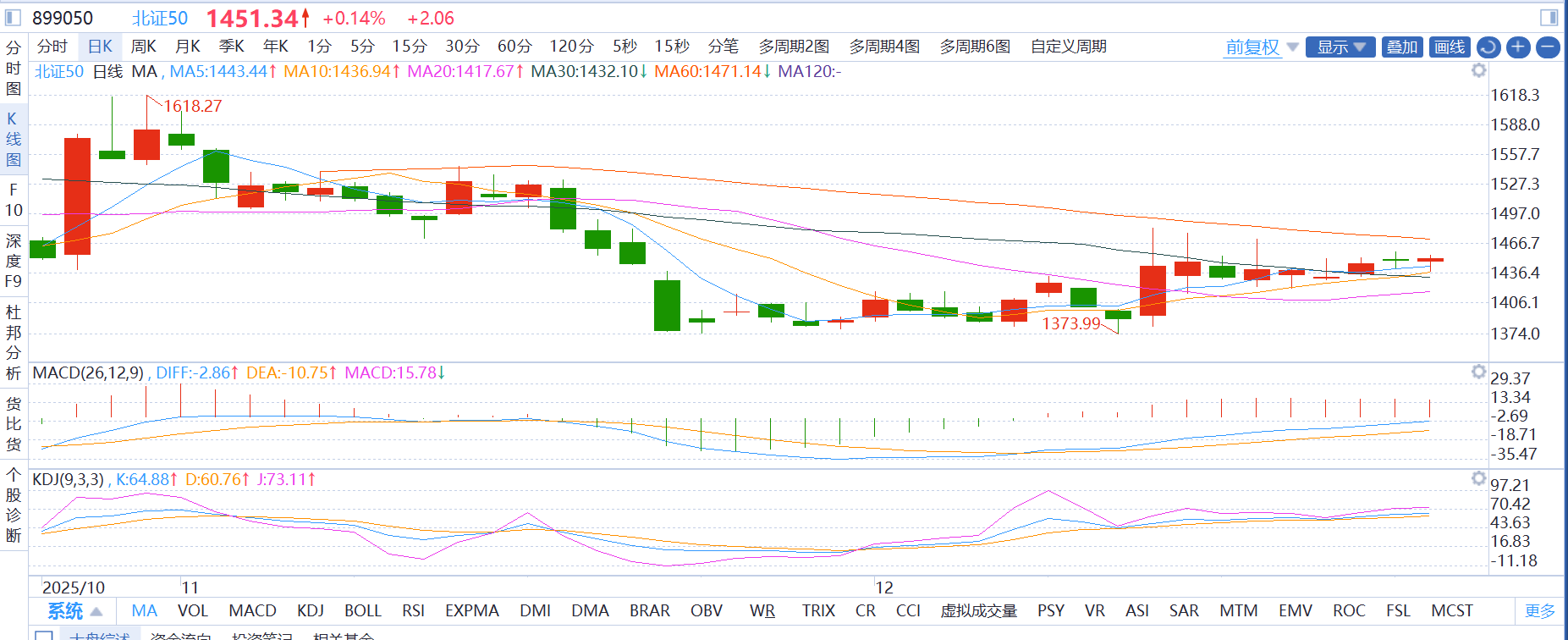 北证50:指数微涨0.14%,K线在5日线附近纠缠,波动率下降。这是变盘的前兆。