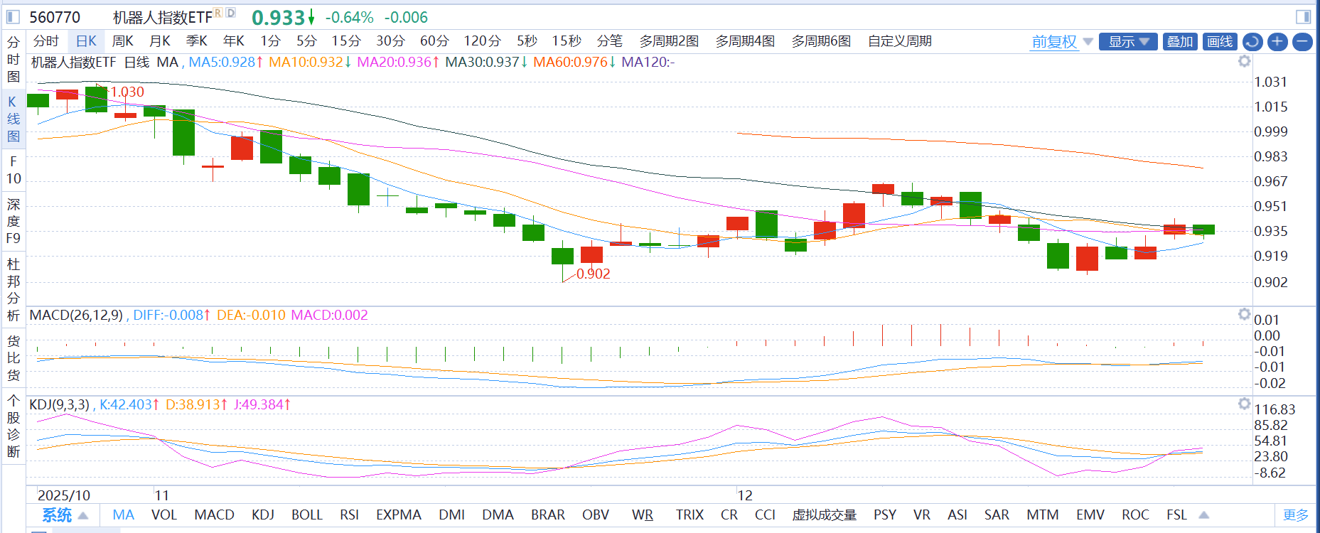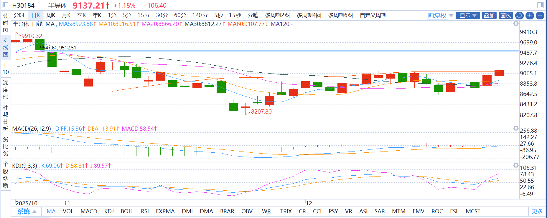 半导体:半导体板块今天表现坚挺,光刻机方向领涨。K线已经站稳了短期均线组,MACD红柱开始冒头,即将形成“空中加油”的突破形态。